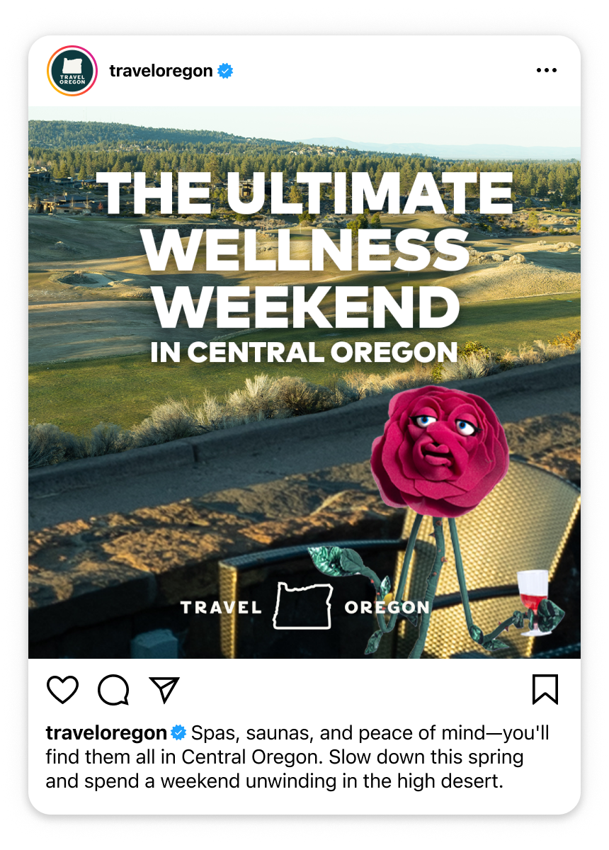 Exploring Oregon can be overwhelming. Travel Oregon wanted to adapt their existing “Travel Oregon with Travel Oregon” campaign concept into a social-first approach, using their puppet sidekicks and local guides to engage potential travelers and inspire them to book their next adventure.